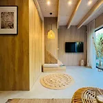 A Domki Naturalnie - Dom Duo 1 Glodowo dispõe de terraço com vistas para a piscina, bem como de piscina privada.